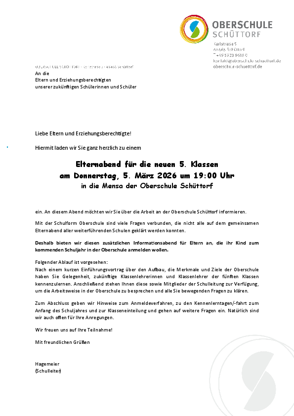 Die Anmeldung für die neuen 5. Klassen findet in der Zeit vom 14. April bis 16. April 2026 statt. Nähere Informationen zu den Anmeldezeiten und den benötigten…