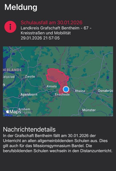 der Landkreis Grafschaft Bentheim teilt soeben mit, dass aufgrund der Warnung vor Glätte und Schnee der Unterricht an allen allgemein- und berufsbildenden Schulen in der Grafschaft Bentheim am Freitag, 30.01.2026 ausfällt. Die Zeugnisse werden den Schülern nach den Zeugnisferien am kommenden Mittwoch, 04.02.2026 ausgehändigt.