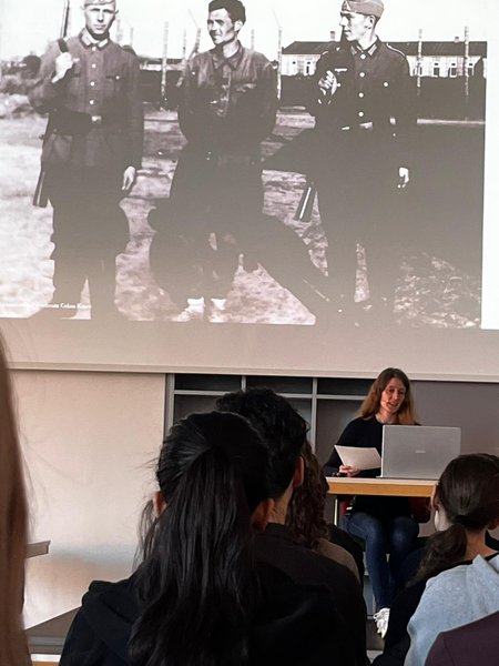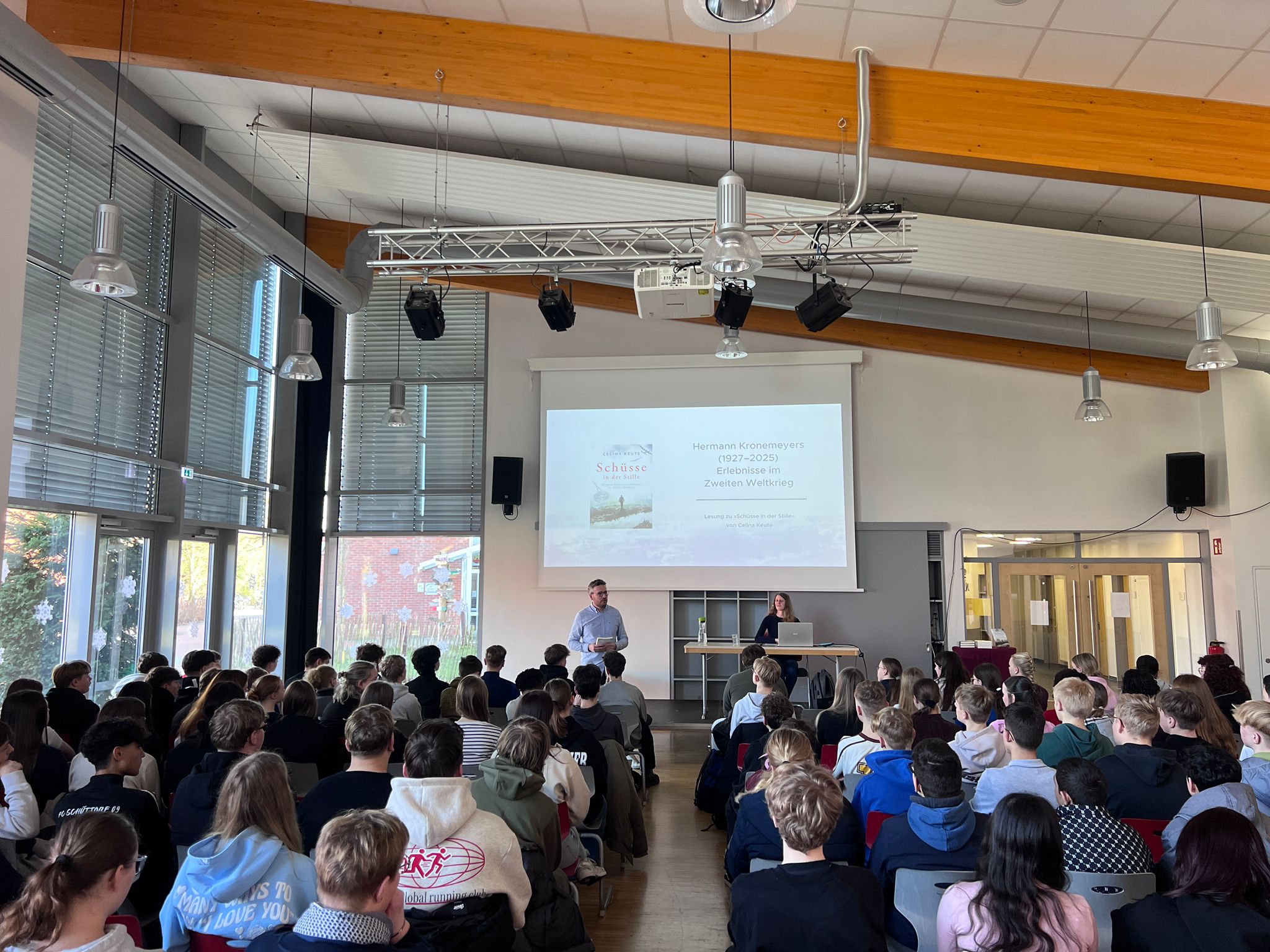 Durch die unmittelbare Nähe der Schauplätze und auch durch die Präsentation dazugehöriger Fotoaufnahmen entstand in der Mensa unserer Schule eine gespannte Atmosphäre. Die ehrlichen Schilderungen Kronemeyers wurden durch die Lesung von Frau Keute für unsere Schülerinnen und Schüler sehr greifbar und authentisch präsentiert.
