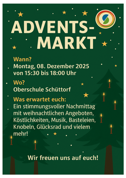 In diesem Jahr findet bei uns an der Oberschule Schüttorf wieder der beliebte Weihnachtsmarkt statt. Schüler und Schülerinnen, Lehrkräfte und alle Mitarbeitenden legen sich ins Zeug um Ihnen und euch einen stimmungsvollen Nachmittag zu bieten. Weihnachtliche Köstlichkeiten, kleine Basteleien, Musik, Knobeln, Glücksrad und vieles, vieles mehr erwartet die Besucher.